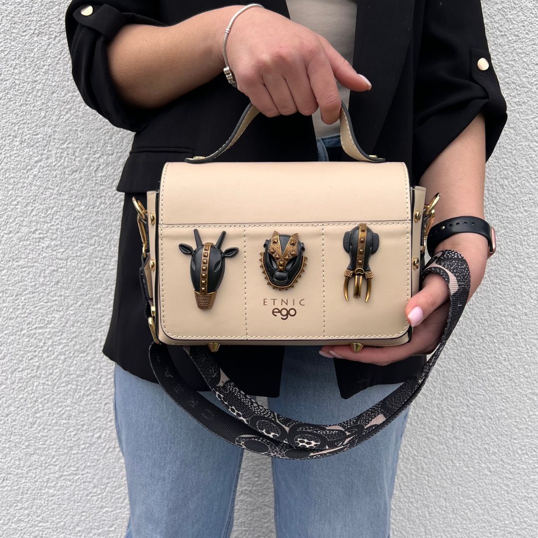 Istaknite se ovom jedinstvenom večernjom torbicom, oblikovanom s velikom pažnjom prema svakom detalju. Kombinacija luksuznih tekstura i upečatljivog metalnog V detalja čini je pravim modnim statementom. Odvojivi remen dodaje svestranost jer torbicu možete nositi u ruci ili kao elegantnu torbu preko ramena. Savršen izbor za one koji cijene i stil i funkcionalnost.