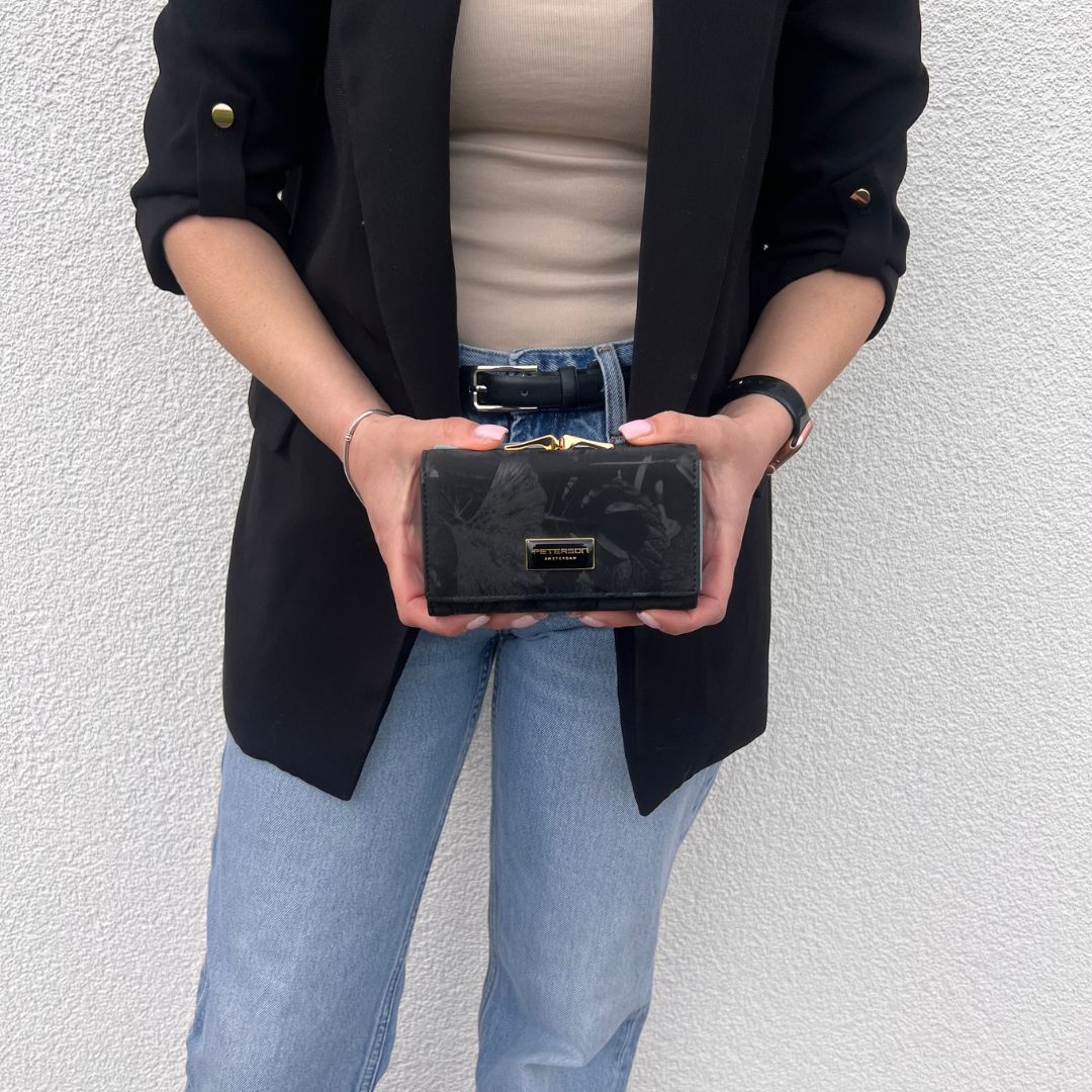 Ponekad nisu potrebne boje. Samo prava linija i prava žena koja je nosi. Ovaj Peterson novčanik izjava je stila – crno-bijeli cvjetovi nježno se prelijevaju po lakiranoj površini, poput tinte na papiru. U njemu ima nečeg sofisticiranog, gotovo poetskog. A iznutra – praktična svijetlosiva unutrašnjost sa svim funkcijama koje očekuješ: RFID zaštita, pregledan raspored i mekani dodir prave kože.