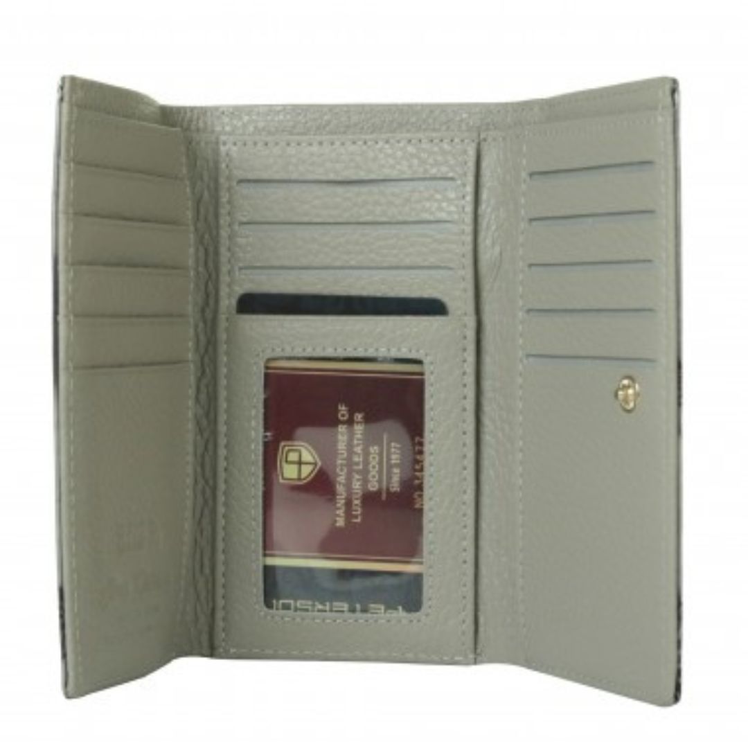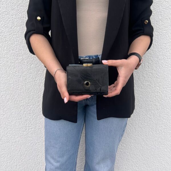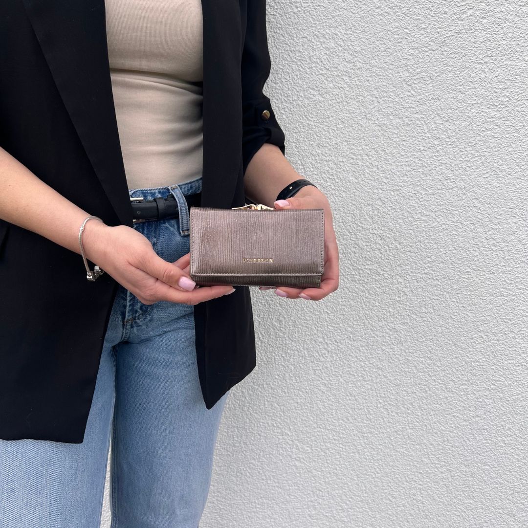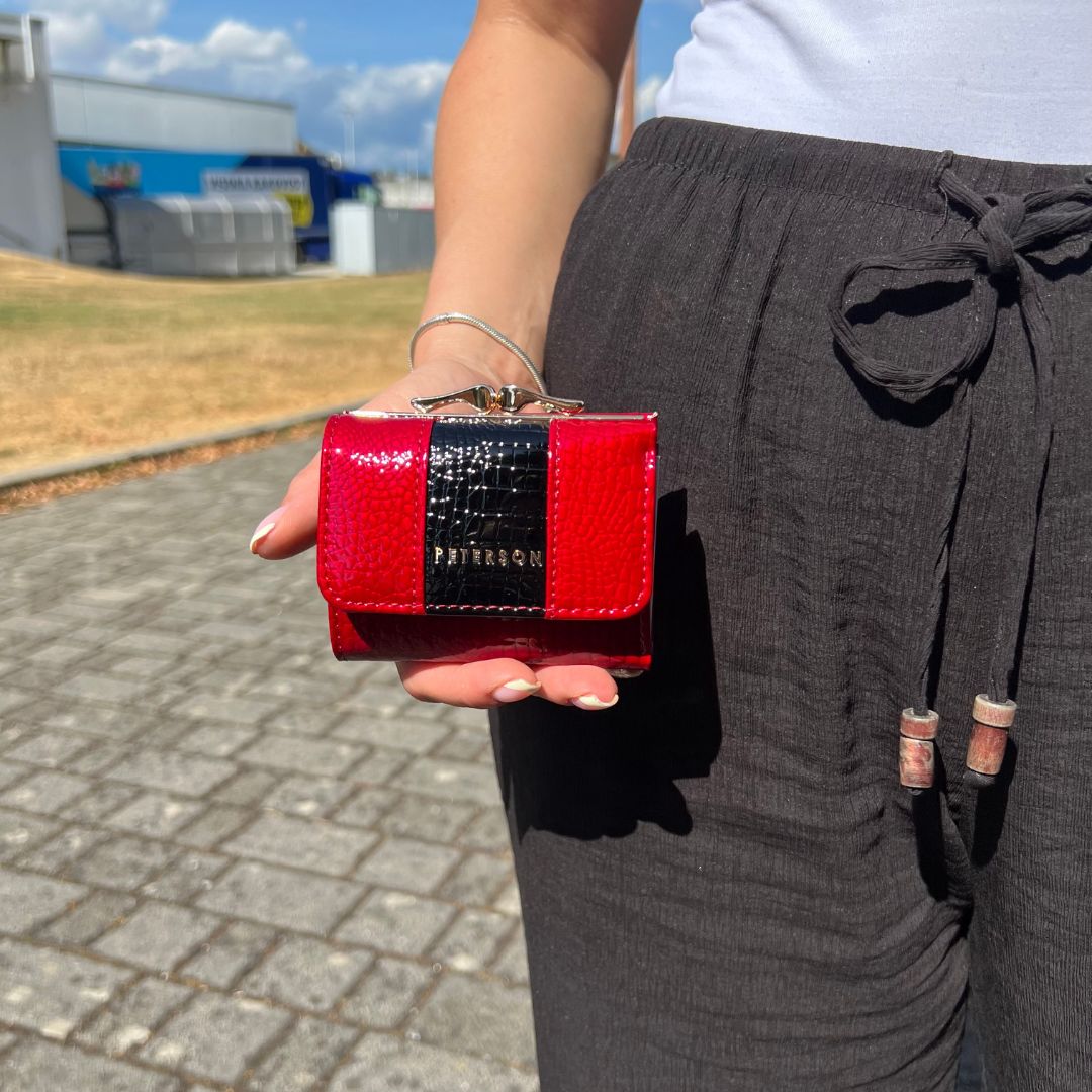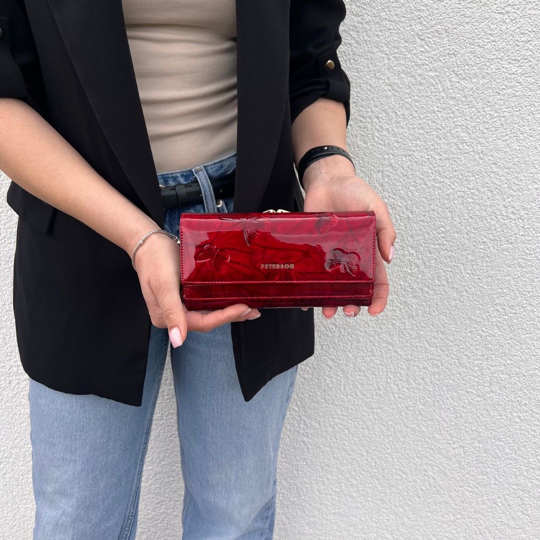 Ovaj elegantni novčanik Peterson u klasičnoj crnoj boji kombinira pravu kožu i eko kožu, pružajući savršen spoj kvalitete i modernog izgleda. Sjajna površina s diskretnim uzorkom daje dozu prestiža, dok metalni detalji upotpunjuju cjelokupni dojam. Unutrašnjost omogućuje praktičnu organizaciju kartica, dokumenata i gotovine, a RFID zaštita brine o sigurnosti vaših podataka. Idealan izbor za svakodnevnu eleganciju.