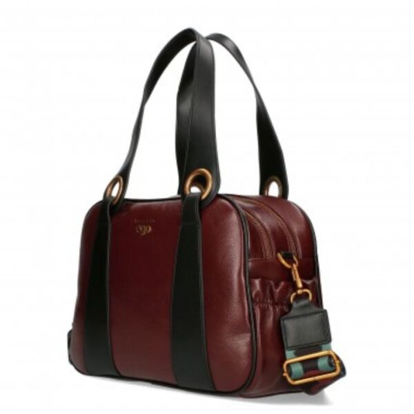Ta torbica je popolna definicija brezčasne elegance z modernim robom. Izdelana iz kakovostnega umetnega usnja, mehka, a strukturirana, ustvarjena za žensko, ki prisega na stil brez kompromisov. Kombinacija bordo rdeče osnove in izrazitih črnih detajlov ustvarja kontrast, ki pritegne pogled – subtilno, a močno.